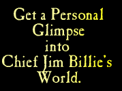The life of Seminole Chief Jim Billie is filled with music and adventure, family and fun. His main job is Chairman of the 2700-member Seminole Tribe of Florida, a pursuit that keeps him constantly traveling in airplanes, pickup trucks, swamp buggies, canoes and airboats. From his home in the Big Cypress Swamp, where he lives with wife Lesley and sons Micco and Kowoko, Chief Billie connects to the outside world as both statesman and songwriter. Join us on these pages for an intimate online glimpse into Chief Jim Billie's world. And, hey, if you've taken any good pictures of Chief Billie, e-mail them to us and we'll add them to the scrapbook.